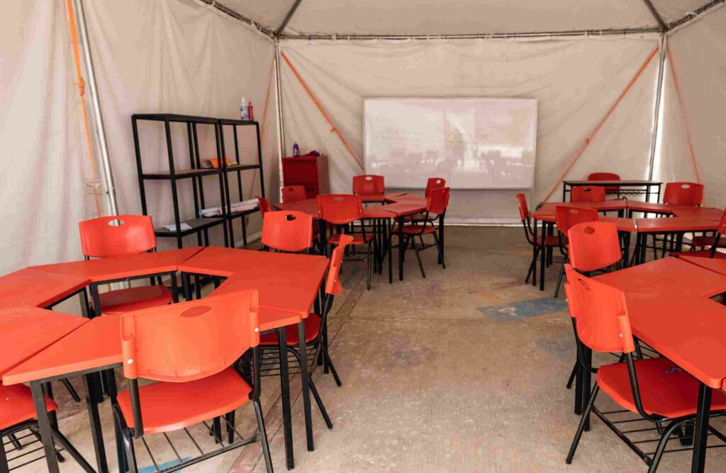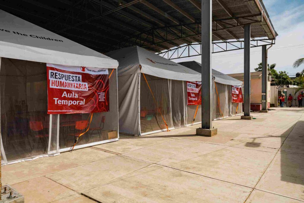 Para que la niñez de Guerrero pudiera continuar con su educación, desde Save the Children, instalamos aulas temporales que le permiten a las niñas y niños recibir clases en un espacio adecuado cuando su escuela no está disponible debido a una emergencia, como en este caso. Se fabricaron con materiales aislantes para reducir al mínimo las altas temperaturas de la zona y en su interior se puede encontrar mobiliario educativo, acceso a agua potable y, además, tienen ventanas que permiten la circulación del aire y una cubierta de lona para la lluvia.